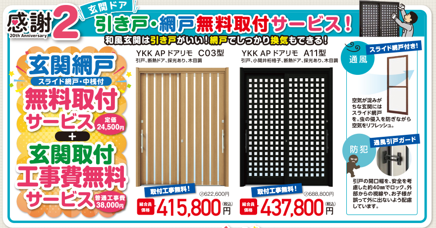 (1)玄関網戸(スライド網戸・中桟あり 定価24,500円)無料取付サービス