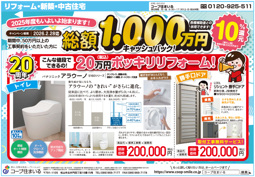 20周年プレ企画(8月号)で「20万円ポッキリ」で企画したトイレ及び勝手口ドア等が大好評となり、メーカー及び問屋の協力で継続できることになりました。よって今年度は毎月の企画として提案していきます。是非ご検討ください。