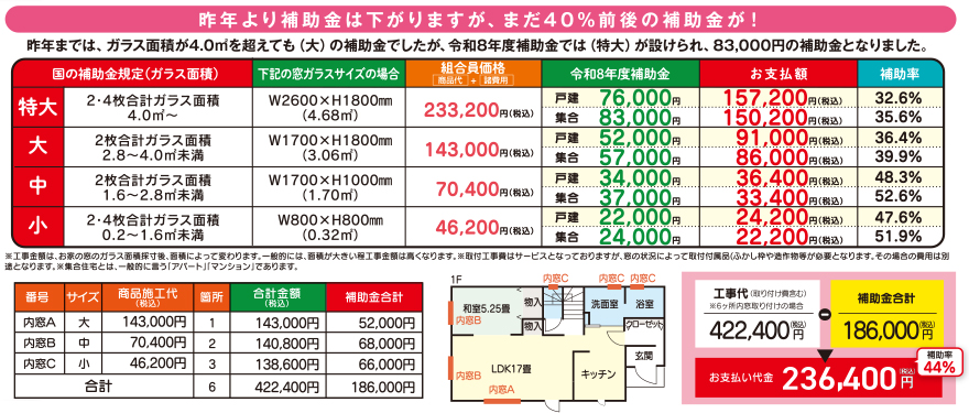 先月のご案内に続いて、令和8年度「内窓」補助金で家計応援できる4つの内容を再度お知らせします。是非この機会に考えてみてください。