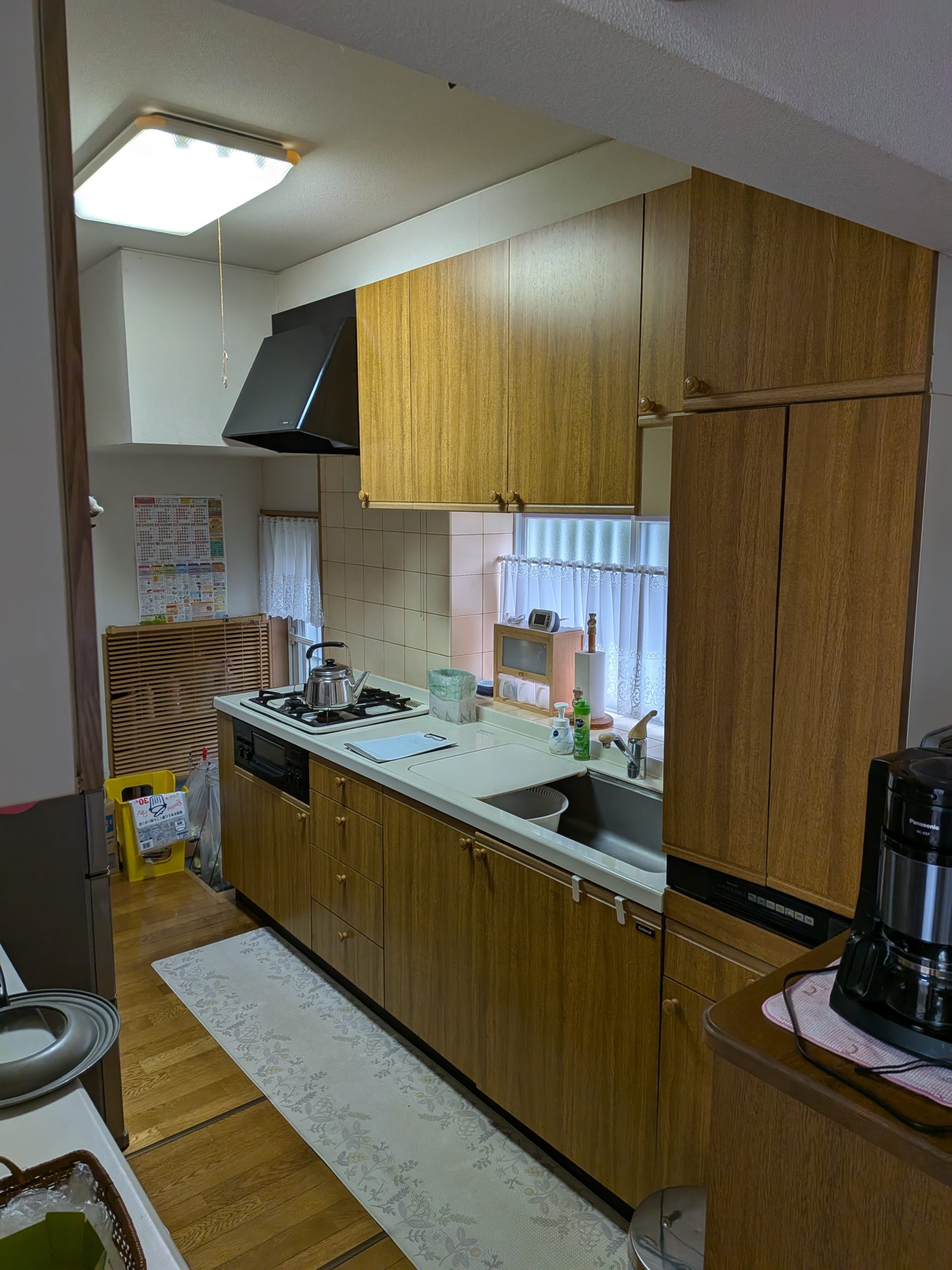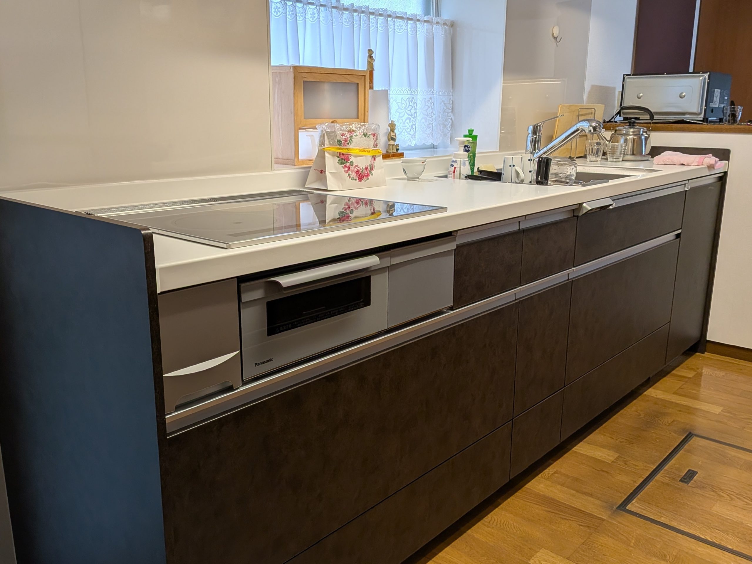 システムキッチンの下台を交換して、フロントオープンの食洗器を取付けました。卓上の乾燥機をのけることによって、キッチンの天板を広く使うことができるようになりました。